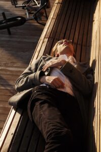 He then placed a bottle of vodka and a beer into a bag. However, he was so tired that he fell asleep before he left the bar.